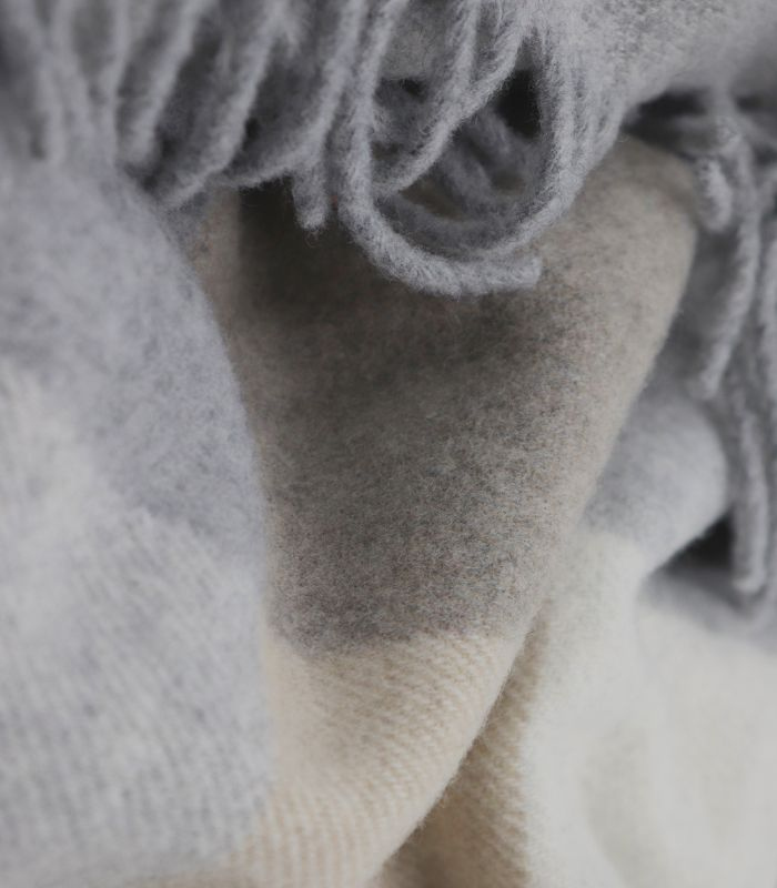 Ce plaid canapé en cachemire (20 %) et laine (80 %), tissé en Italie, se décline dans une élégante harmonie de beige et de gris.